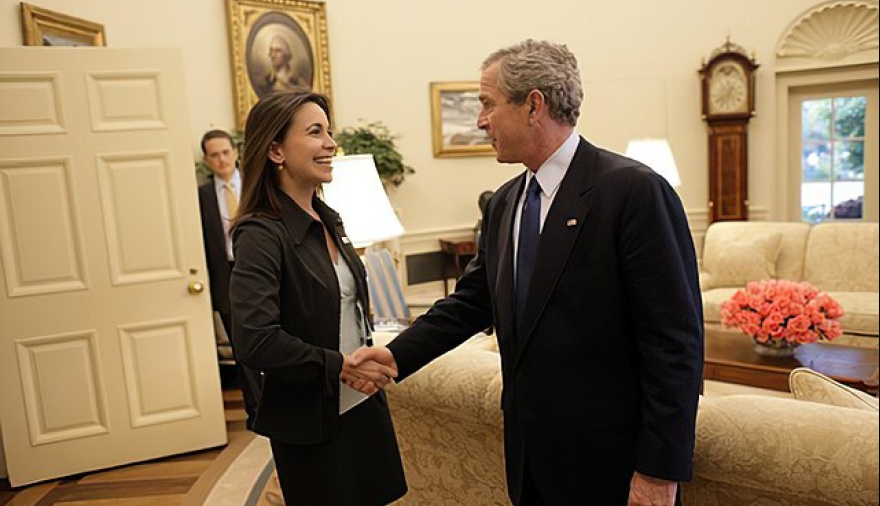 En 2002, el presidente democráticamente electo de Venezuela, Hugo Chávez, fue secuestrado y recluido en la isla La Orchila. Corina Machado (foto), varios empresarios y el New York Times apoyaron el golpe. La oposición proclamó a Pedro Carmona (empresario y miembro del Opus Dei) como nuevo presidente. Carmona decretó la disolución de la Asamblea Nacional, la Corte Suprema y otras instituciones. Machado firmó la declaración de apoyo a esas medidas.